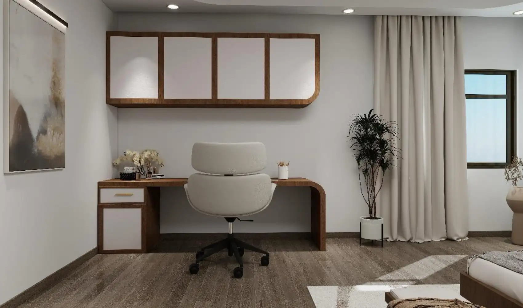 Purposefully designed, the office balances focus with comfort, filling the workspace with natural light and clarity. Clean lines, muted tones, and thoughtful accents encourage productivity while maintaining calm. Every detail is arranged with intention, supporting both efficiency and inspiration. The result is a versatile setting that adapts to concentrated tasks and creative thinking, establishing the office as a hub of energy and ideas.